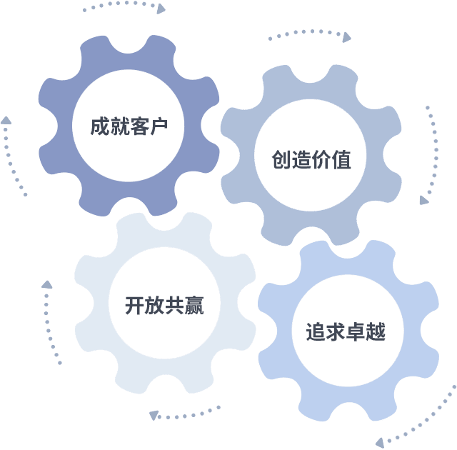 成就客户是一切决策的出发点,,,创造价值是衡量所有工作的标准,,,,追求卓越是我们做事做人的态度,,,开放共赢是我们的格局也是最终的结果。。价值观的齿轮环环相扣,,,推动着组织里的每个人不断向前。。。。